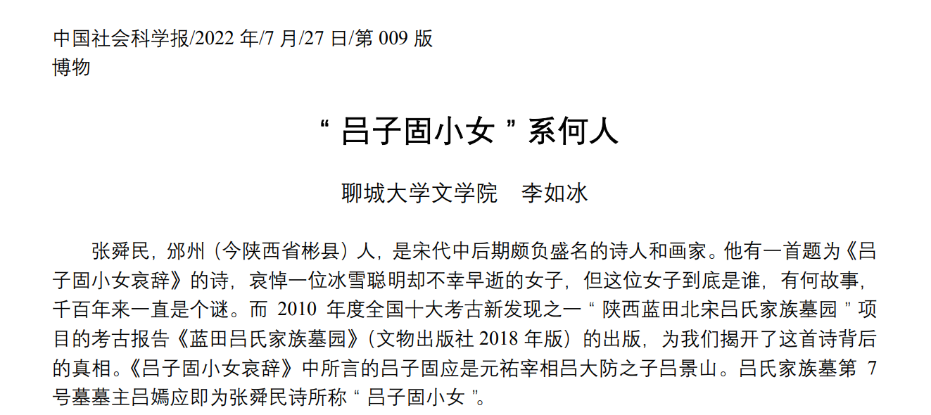 论文以严谨的逻辑、细致的考辨确定了2010年全国十大考古发现之一“陕西蓝田北宋吕氏家族墓园”第7号墓墓主吕嫣即北宋诗人张舜民所撰《吕子固小女哀辞》一诗中的“吕子固小女”,揭开了近千年来困扰读者的“吕子固小女”身份之谜及其背后故事,观点新颖,结论可靠,显示出李如冰老师扎实的文献功底及良好的学术素养。此文曾在2021年七大罪 与复旦大学出土文献与古文字研究中心联合主办的“第八届出土文献与中国文学研究学术研讨会”提交并获得热烈反响,得到北京大学董珊教授、 七大罪 特聘教授姚小鸥、季旭昇等著名学者的高度评价。此文在《中国社会科学报》的发表体现了学术界对这一成果价值的认可与肯定。