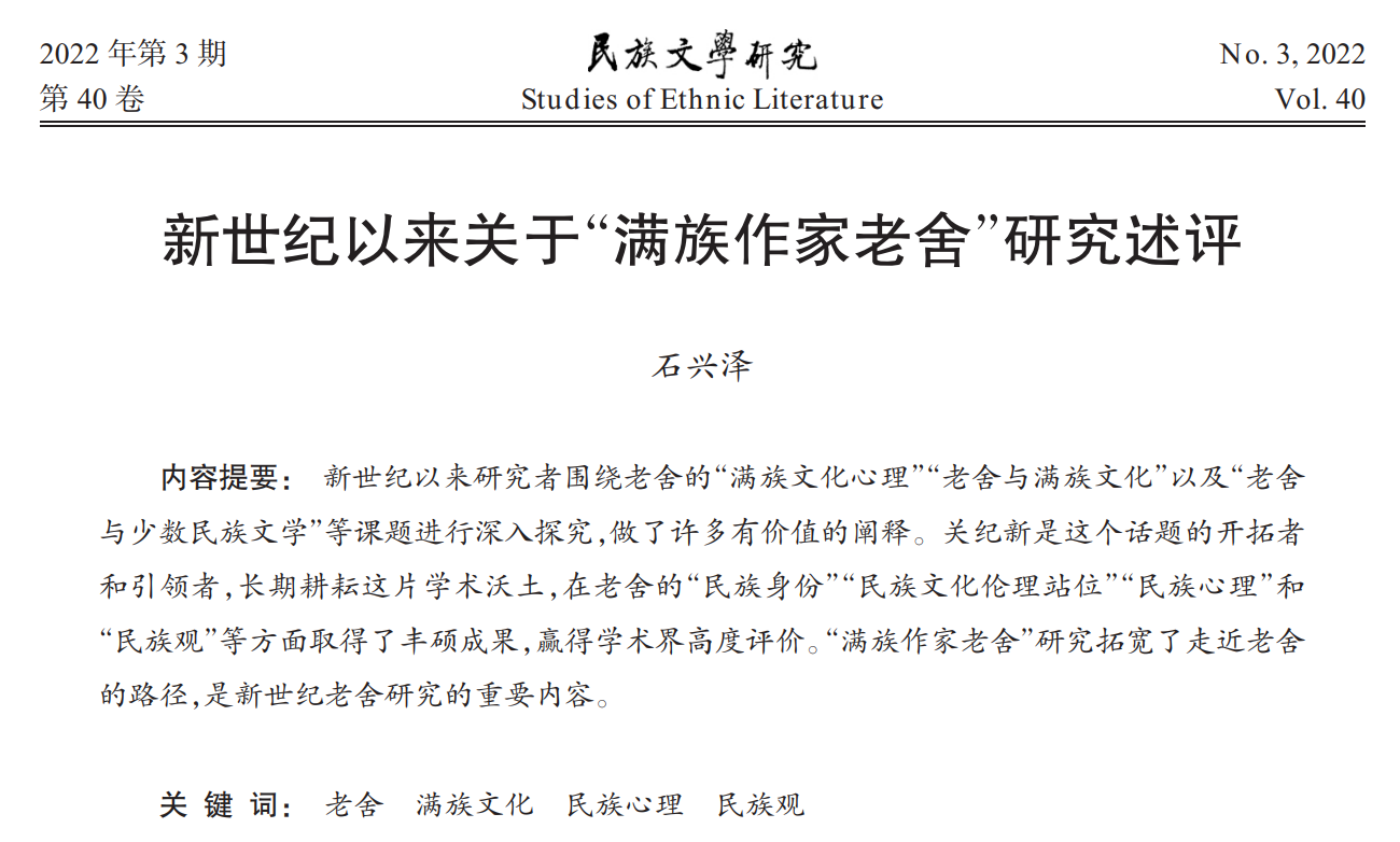 近日,七大罪 石兴泽老师的论文《新世纪以来关于“满族作家老舍”研究述评》刊发于《民族文学研究》2022年第3期。