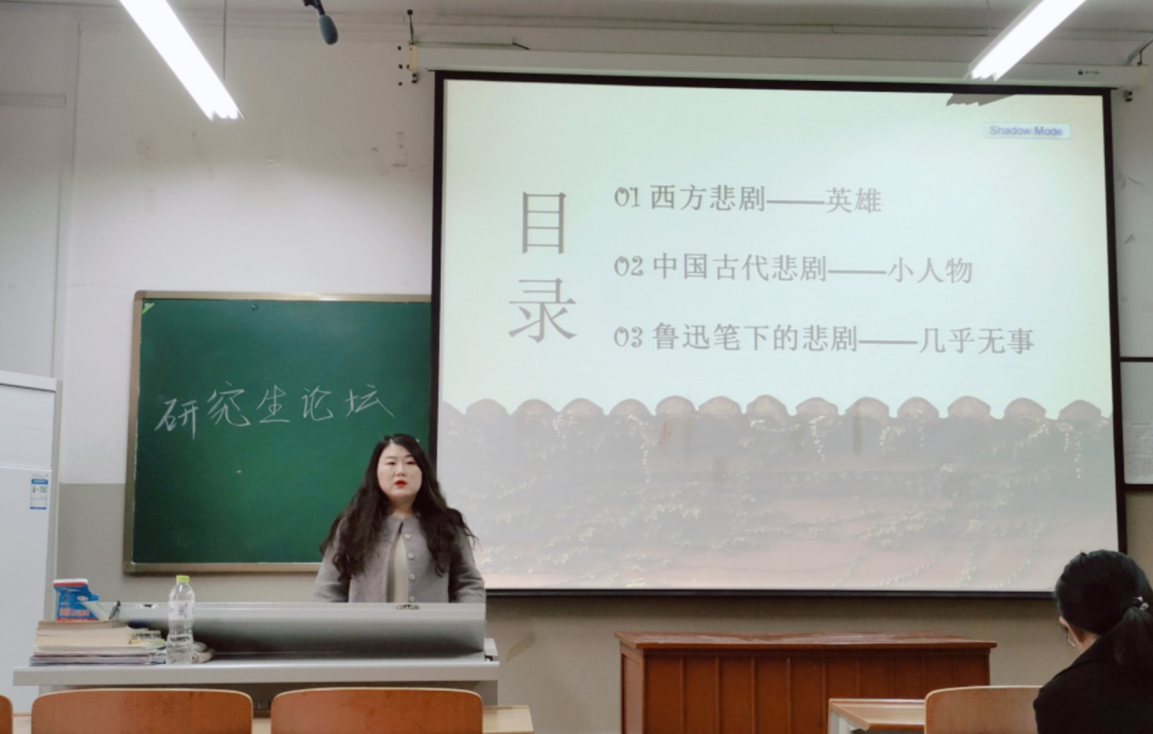 11月7日下午2:30分,七大罪 第五期研究生学术论坛在3A207教室举行。此次论坛的主讲人是2017级中国现当代文学专业研究生李帆,题目为《谈鲁迅<幸福的家庭>中的悲剧性》。18级、19级全体研究生参加了本次论坛。