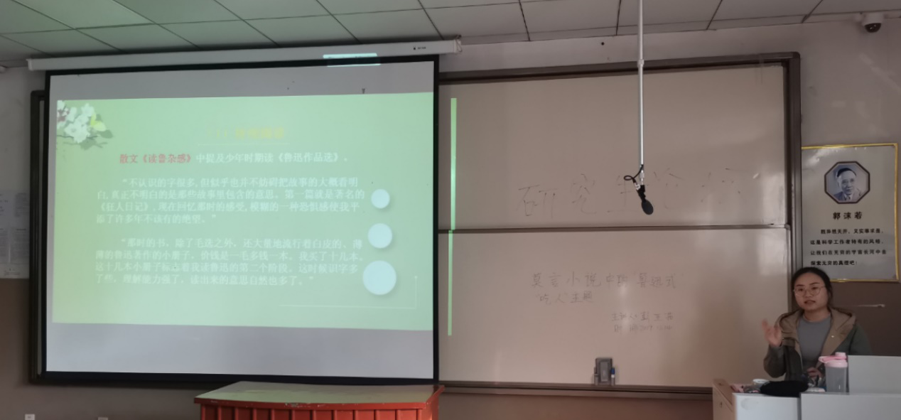 彭亚茹将经典搬到大家面前,由浅入深地向大家展示了莫言小说中的“鲁迅式”“吃人”主题,让大家了解了这两位文学大家对于封建传统文化“吃人”的强烈抨击,使在座的全体研究生们受益匪浅。(文/王涵、图/张丁丁、审核/张培培)