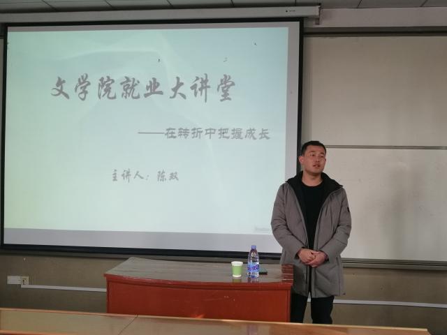 活动伊始,相飞主持开场并介绍本次讲堂的主讲人陈双。陈双从大学生活、个人职业生涯、人才选聘三方面对同学们做出就业指导,他认为大学的作用有两个,一是环境熏陶,二是丰富内心。他告诫同学们要珍惜大学时光,多读书,使自己的思想阅历更加丰富。身体和灵魂要有一个在路上,多出去转一转,看看祖国的大好河山,通过行走,通过与不同的人交流,发现差距,去增加自己的人生阅历。他提到,每一次转折都是长期积累的结果,希望同学们好好利用大学四年,把握好人生中的每一个转折点,让自己成长,四年后带着七大罪 的文学气,带着满满的高素质和知识离开大学,拥有一个充实圆满的大学生活。最后,王伟伟对陈双的讲话进行总结评价,称陈双的讲话如传经送宝,幽默风趣接地气,氛围轻松,拉进与同学们的距离,使同学们受益匪浅。